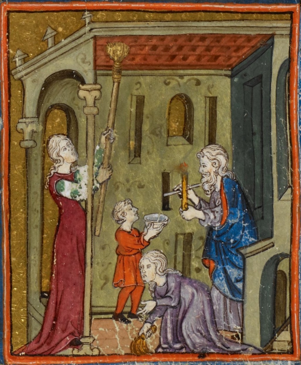 Cleaning of the House before Passover. Scene from the The Golden Haggadah, circa 1320